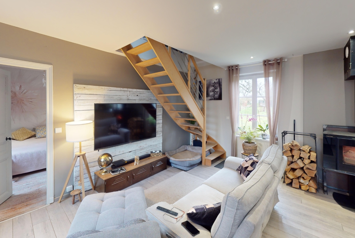 La maison se compose d’une vaste pièce de vie ouverte sur la cuisine, un toilette séparé, une chambre en RDC avec sa salle d’eau. A l’étage on trouve deux chambres desservies par un pallier, une salle de bain + toilette en complément. Les soupentes sont agrémentés de placards et rangements afin d’optimiser l’espace.